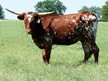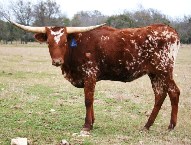 Sequence is a ruby red cow with white specs and higher set horns with a lot of total horn. She is out of the well known Gun Smoke bull and is the dam to our RZ Josey Wales (91" TtT). She is 75" TtT....
